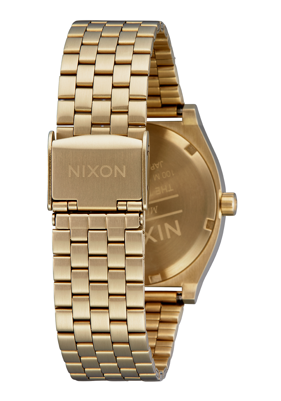 The Nixon Time Teller watch features a solid stainless steel case and a stainless steel bracelet, making it durable for daily wear and a hardened mineral crystal for added protection. The stainless steel case and bracelet provide protection against daily wear and tear, ensuring longevity and reliability.